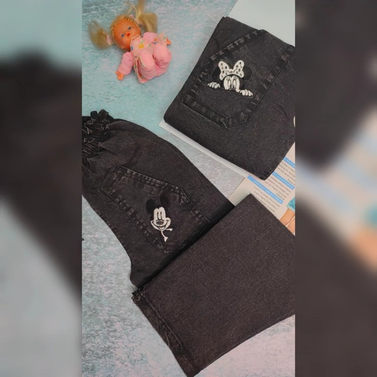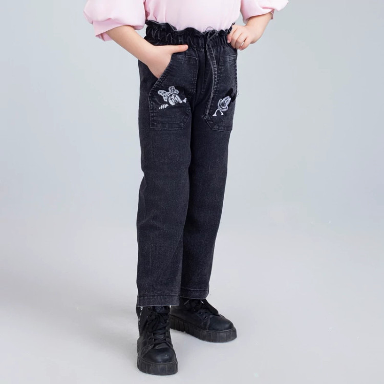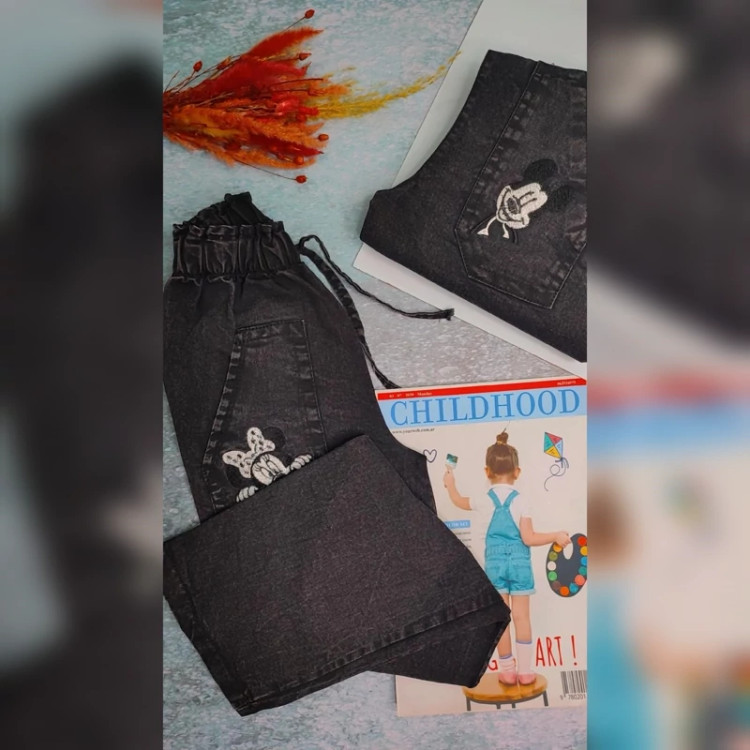 شلوار لی دخترانه نیم بگ گلدوزی میکی موس ذغالی کمرکش - مناسب 6سال تا 14 سال - قد 65 تا 90