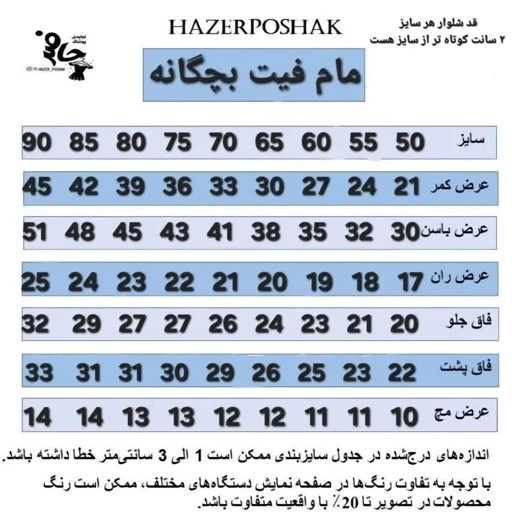 شلوار مام فیت بچگانه از سایز 50 تا 90 جدول سایزبندی عکس آخر قرار داده شده هست اندازه قد شلوار از سایز 2 سانت کمتر هست به طور مثال سایز 75 قد شلوار 73 هست و اینکه عرض کمر بدون کشسانی اندازه گرفته شده و تا اندازه عرض باسن کشسانی دارد. سایز 50 . 55 . 60 = 170 تومان سایز 65 . 70 . 75= 205 تومان سایز 80 . 85 . 90= 236 تومان زنانه این مدل هم از سایز 40 تا 50 موجود هست رنگ کرم ، مشکی ، نخودی ، سفید، زیتونی ،سدری،شکلاتی ،نسکافه ای. طوسی سایز 50 ، 55 ، 60 ، 65 ،70،75،80،85،90